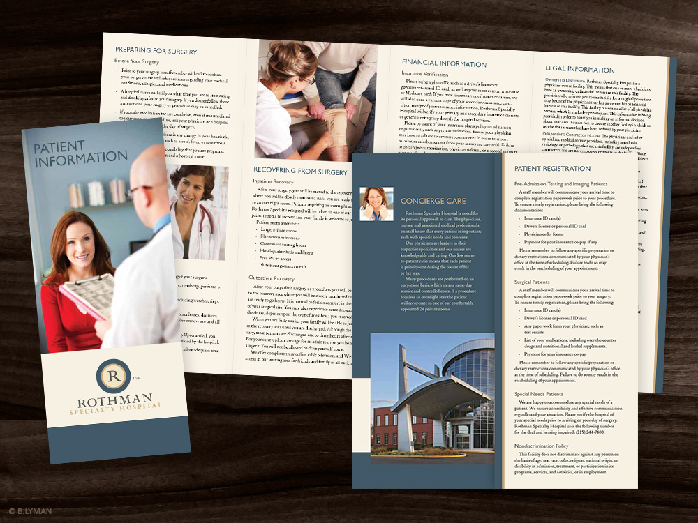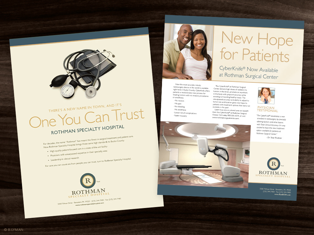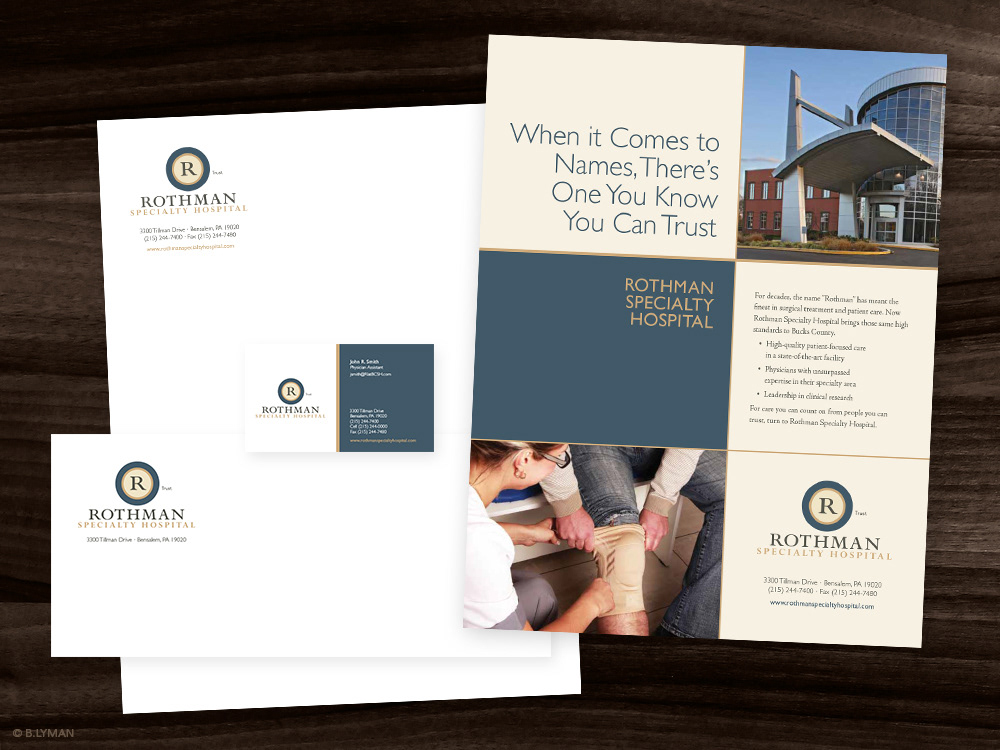 Stationery, print advertising, and patient brochure for Rothman Specialty Hospital. (Produced with InQuest Marketing of Overland Park, Kan.)